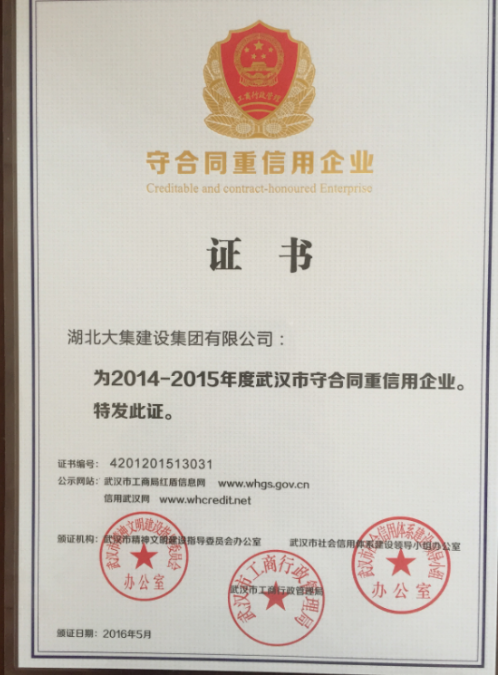 湖北大集建設(shè)集團(tuán)喜獲“守合同重信用”榮譽(yù)稱號(hào)