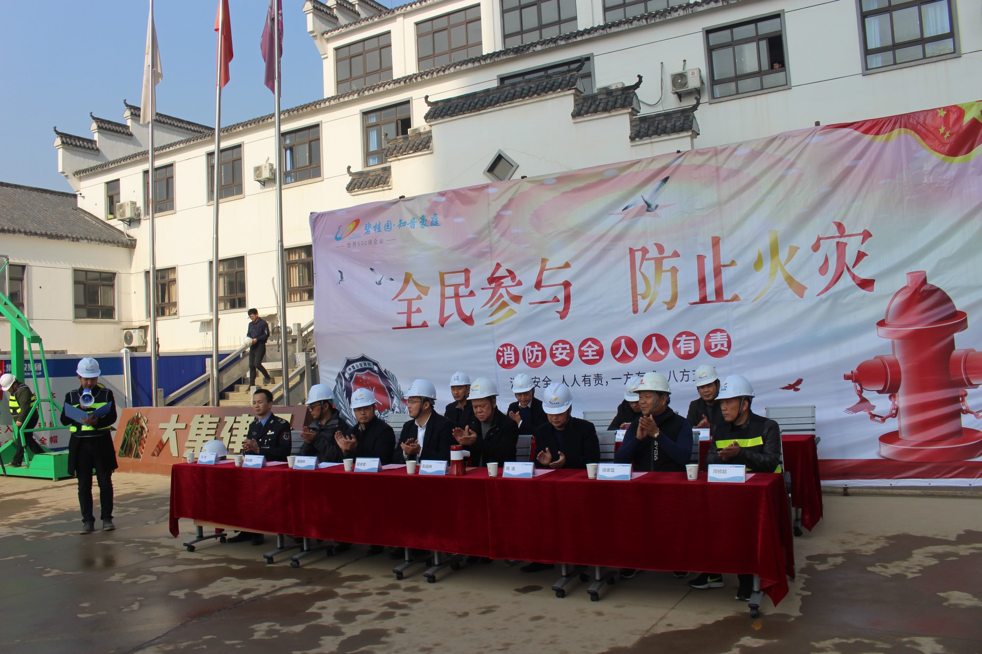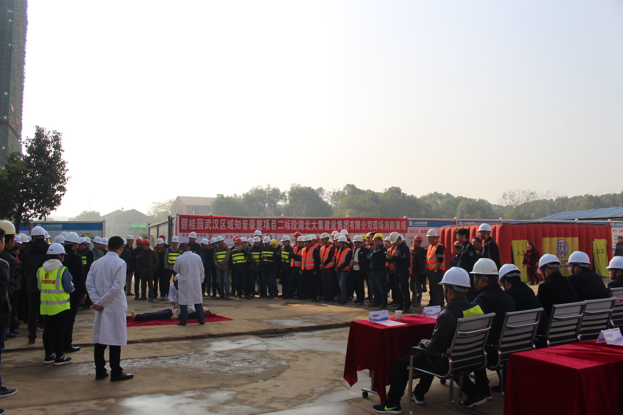蔡甸區(qū)建管站石進(jìn)洲書記、周波站長、范真科長、宋樹兵科長,蔡甸區(qū)大集街道周修超主任,碧桂園武漢區(qū)域漢口片區(qū)執(zhí)行總裁屈宇宏、武昌片區(qū)執(zhí)行副總裁鄢瑞林、工程管理部副總經(jīng)理葛志鵬、安全管理部副總經(jīng)理吳家應(yīng)、知音豪庭項目副總經(jīng)理馮俊林,湖北大集建設(shè)集團副總經(jīng)理徐家富等出席參加了此次消防演習(xí)活動。