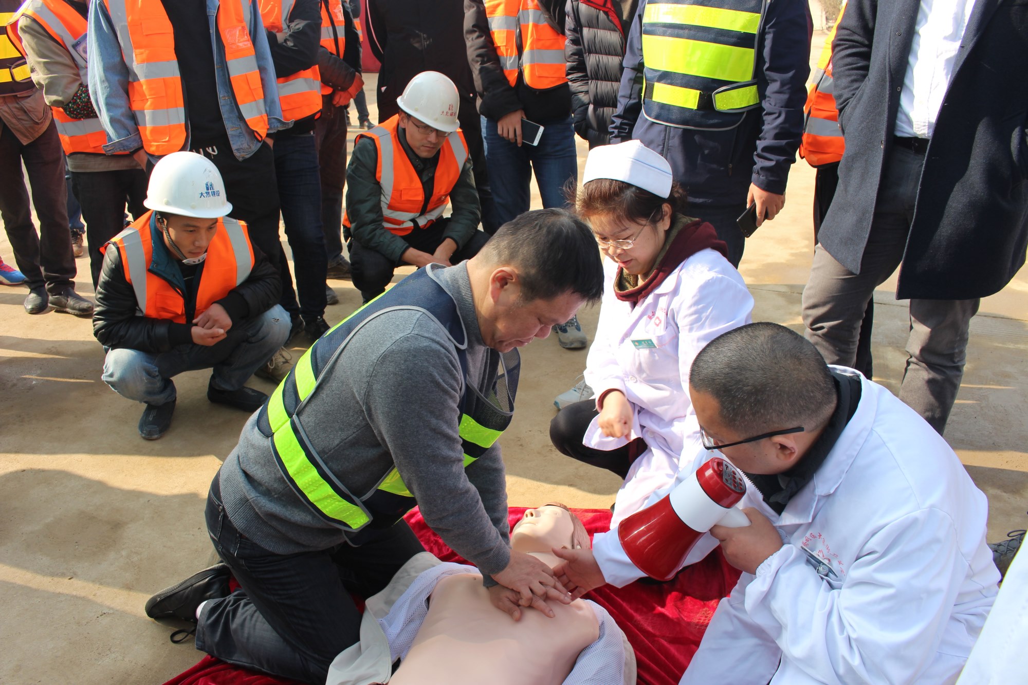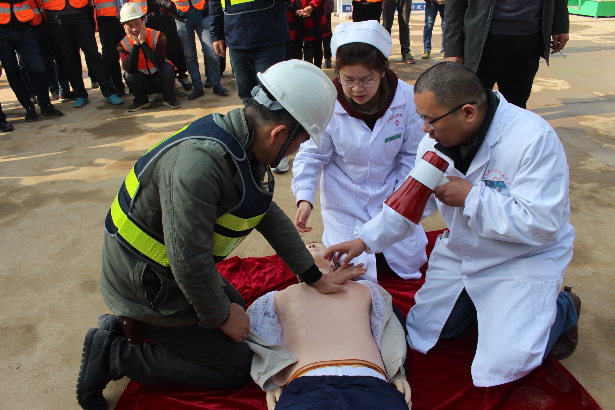 本次演習(xí)的第一個項目是心肺復(fù)蘇,由蔡甸區(qū)大集街衛(wèi)生院為現(xiàn)場參與人員講解,衛(wèi)生院醫(yī)生借助假人模型,生動形象地為大家講解了如何在現(xiàn)場進(jìn)行心肺復(fù)蘇,強調(diào)了心肺復(fù)蘇的方法及要點。大家興趣濃厚,聽得認(rèn)真,看得仔細(xì),將 “心肺復(fù)蘇”要領(lǐng)熟記于心。講解結(jié)束后,衛(wèi)生院醫(yī)護(hù)人員還手把手指導(dǎo)大家進(jìn)行實際操作,糾正錯誤的操作,并給予說明、講解和正確的示范。