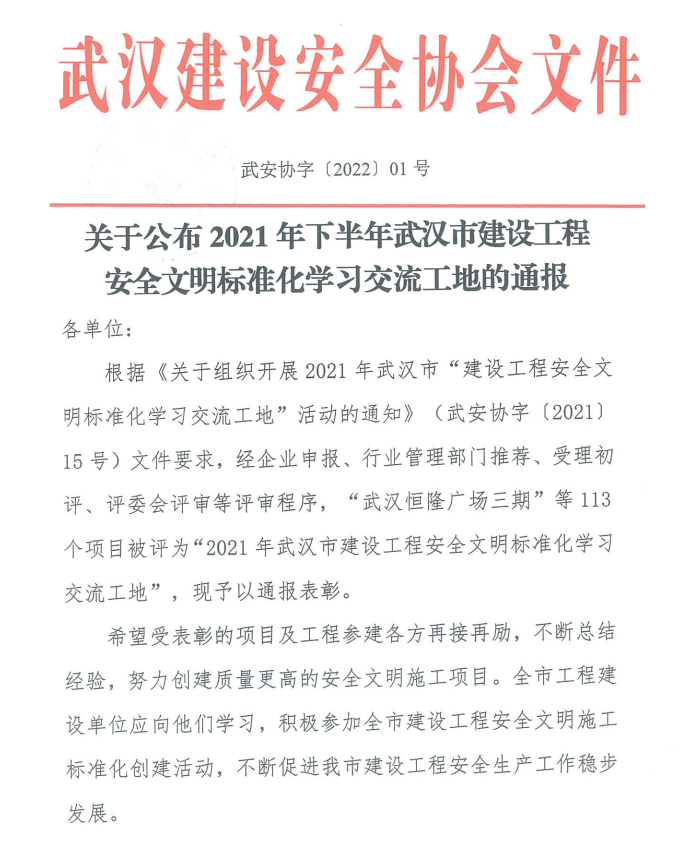 此次獲評“2021年下半年武漢市建設(shè)工程安全文明標準化學習交流工地” 稱號,不僅是對武漢花博匯十二花坊項目部(二期)安全管理和文明建設(shè)水平的肯定,也有力彰顯了公司企業(yè)形象,希望其他項目能多向做得好的項目學習,做到高標準,嚴要求,做品牌項目,打造公司口碑,將項目做成標準示范工程!