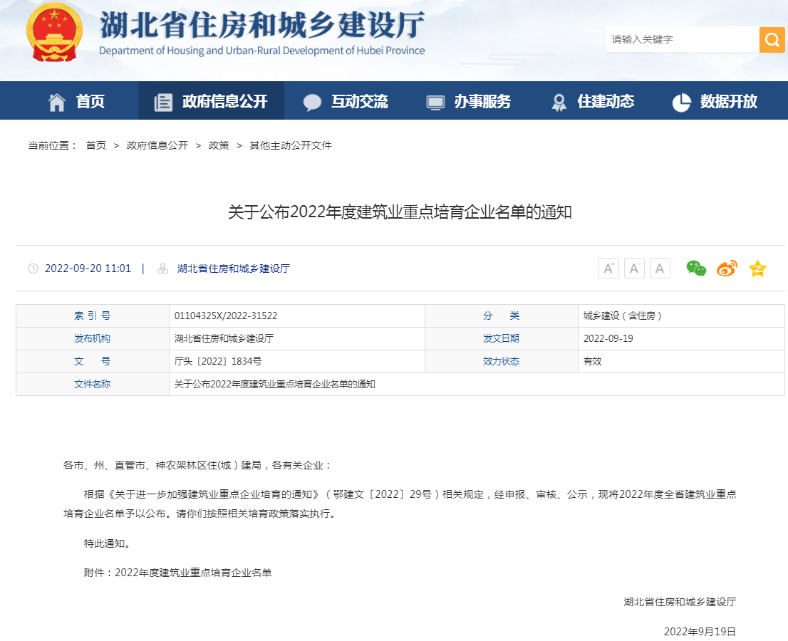 9月20日,湖北省住房和城鄉(xiāng)建設(shè)廳網(wǎng)正式公布湖北省2022年度建筑業(yè)重點(diǎn)培育企業(yè)名單,湖北大集建設(shè)集團(tuán)成功入選!