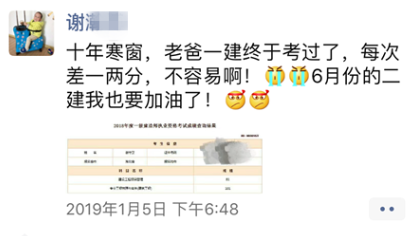 成功會(huì)遲到卻不曾缺席,2017年,謝守衛(wèi)通過(guò)經(jīng)濟(jì)與法規(guī)科目,2018年,通過(guò)管理與實(shí)務(wù)科目。十年磨“一建”,謝守衛(wèi)用他的堅(jiān)持與努力向我們?cè)忈屃艘痪湓挘合胍獙W(xué)有所成,有所收獲,就必須要努力地去堅(jiān)持!