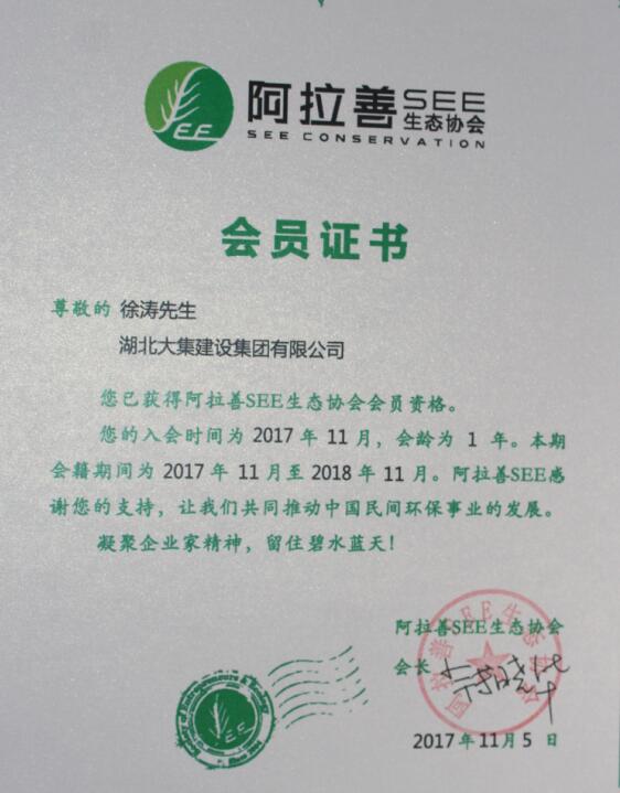 2017年11月,集團董事長徐濤攜湖北大集建設(shè)集團加入阿拉善SEE生態(tài)協(xié)會,正式成為阿拉善SEE會員,與各界熱心環(huán)保的社會人士共同推動民間環(huán)保事業(yè)的發(fā)展,努力為阿拉善沙漠筑起最美的防護墻!